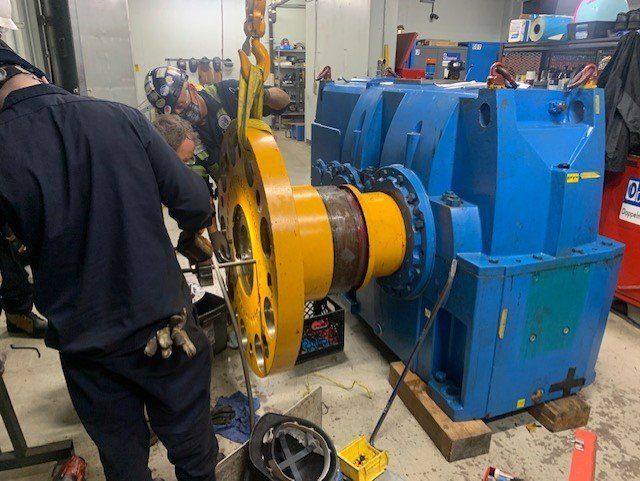 Gearbox was aligned to drive motors and laser aligned to haul rope drive bull wheels, and remains in optimal function today!