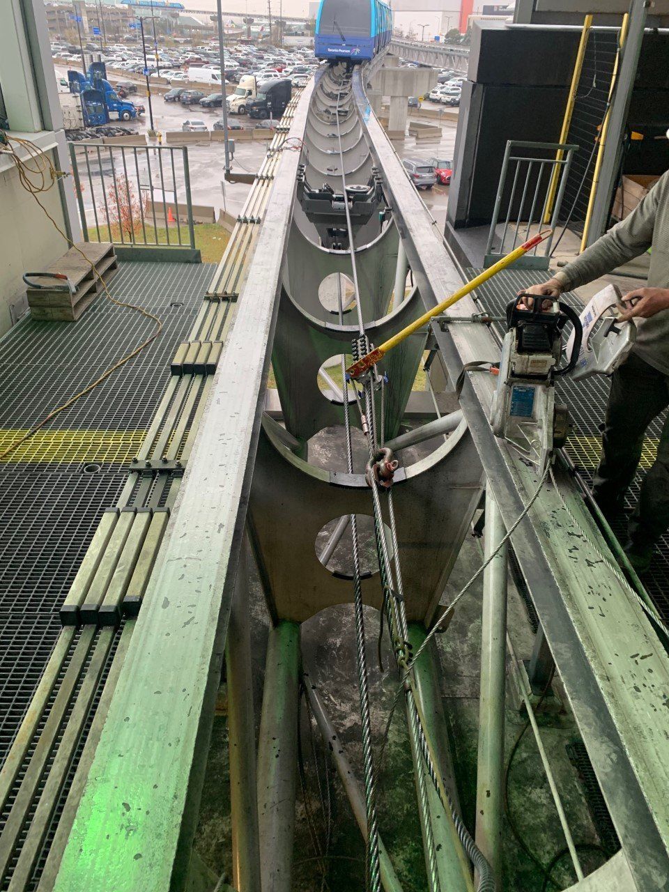 Pearson international airport's automated people mover gear box and haul rope replacement. Here the main gearbox for the link train was replaced with a spare unit while the main was shipped out for a rebuild.